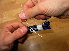 Man hat seinen Takling gewickelt (siehe Bild 1 und 2 des Einfachen Taklings), schneidet aber dann das Takelgarn noch grosszügiger ab (ca. 40-50 cm) ... |